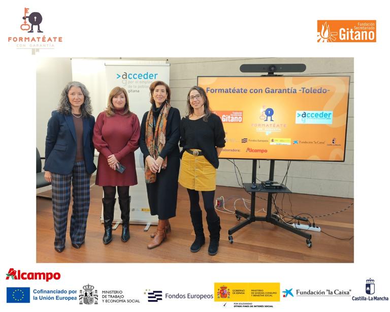 La Fundación Secretariado Gitano en Toledo ha clausurado el programa “Formáteate con Garantía 2025” en un acto celebrado el 14 de enero en la Delegación Provincial de Bienestar Social de Toledo, que contó con la presencia de Rosa María Quirós Querencias, Delegada Provincial de Bienestar Social; Mayka Díaz-Chirón Salamanca, representante de la Fundación “la Caixa”; Rocío Martín López, representante de Alcampo; y Mónica Gómez Medrano, Coordinadora de la Fundación Secretariado Gitano en Toledo. El programa, centrado en la formación en Atención al Cliente en supermercados y dirigido a jóvenes menores de 30 años, ha alcanzado una tasa de éxito del 83,3 %, con resultados destacados en inserción laboral, retorno educativo y promoción de la igualdad, finalizando el acto con la entrega de diplomas a las personas participantes.