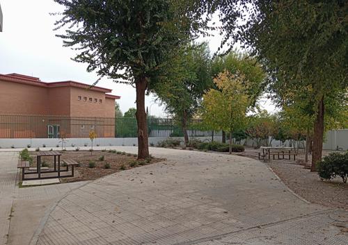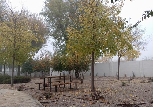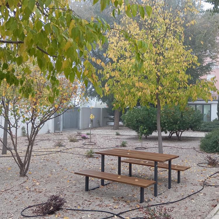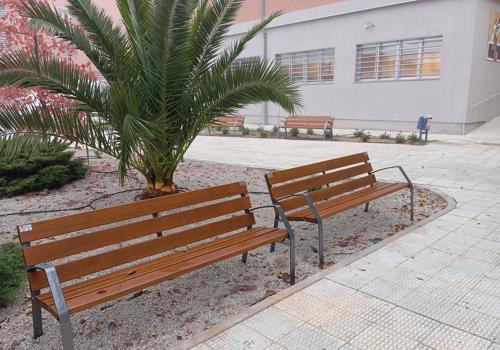 Han retirado los viejos bancos de obra que había y han realizado la instalación de nuevos, más cómodos, junto con la instalación de mesas exteriores para poder disfrutar del jardín, tanto en zonas de sombra para el verano, como en zonas soleadas para el invierno.
