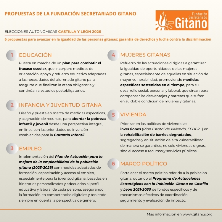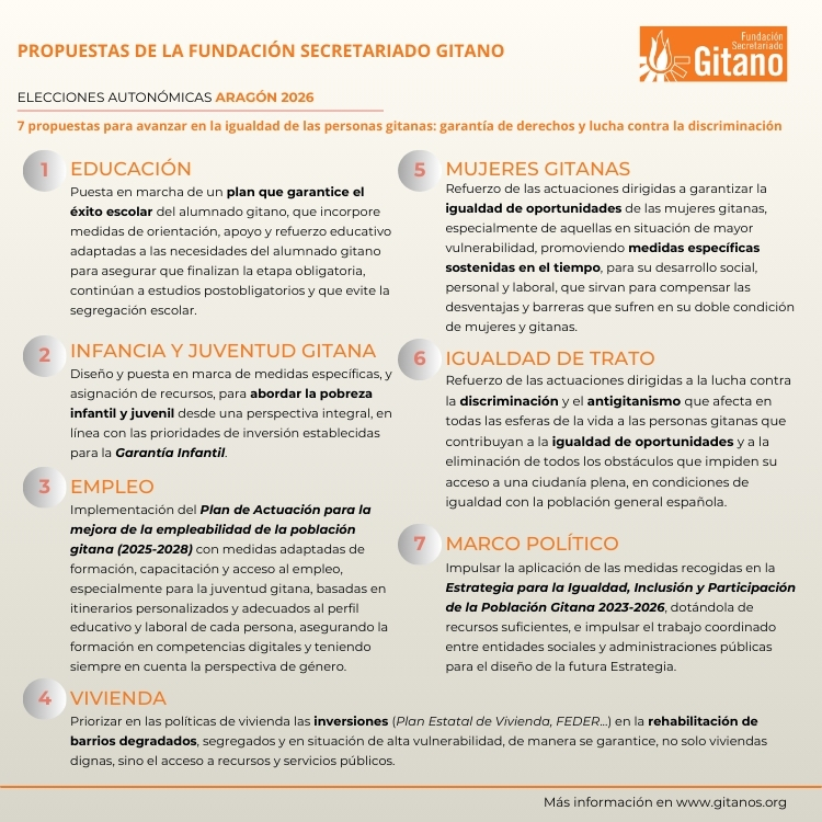 Durante los próximos meses se desarrollarán elecciones en diferentes Comunidades Autonómicas: Extremadura, Aragón y en Castilla y León. Presentamos aquí nuestras propuestas, que haremos llegar a las diferentes candidaturas de los partidos políticos, para avanzar en la igualdad de las personas gitanas en el marco de la garantía de derechos sociales, la lucha contra la discriminación y la promoción del reconocimiento y la participación.