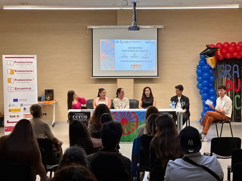 Uno de los momentos más emotivos del encuentro fue la mesa de estudiantes referentes, en la que jóvenes participantes compartieron sus experiencias personales, las dificultades que han encontrado en su trayectoria y sus logros académicos. Sus palabras sirvieron de inspiración para otros chicos y chicas gitanos, animándolos a continuar sus estudios más allá de la enseñanza obligatoria.
