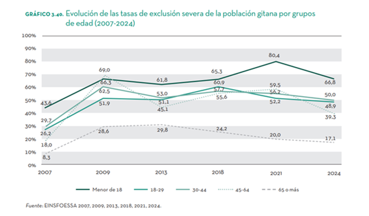 Especialmente alarmante es la situación de los menores de edad gitanos: 7 de cada 10 se encuentran en exclusión severa. La juventud gitana (18-29 años) presenta tasas de exclusión similares a las de 2009 lo que supone que el 61,5% de los jóvenes gitanos están fuera del empleo y la educación.