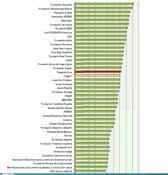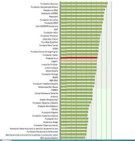 - El coeficiente mínimo deseable de transparencia se estima en 35,83, y la media obtenida es de 32,31, tan solo un 36,73 % de las entidades estudiadas llega o supera el coeficiente mínimo. El coeficiente de máxima calidad se establece en 52, y la entidad que ha obtenido una mayor valoración es la Fundación Aequitas con 46,16.