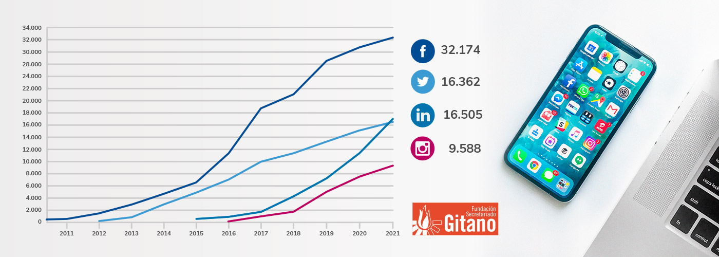 La difusión de nuestro trabajo y de temas de interés para la comunidad gitana ha centrado nuestra comunicación. En 2021 hemos lanzado 28 comunicados y notas de prensa, difundido informaciones a través de nuestra web corporativa –que sumó más de 224.032 visitantes únicos– y de nuestros boletines digitales, que cuentan con 10.500 suscriptores. Gestionamos redes sociales en Facebook, Twitter, Instagram, LinkendIn y Youtube, donde en 2021 alcanzamos los 80.000 seguidores a nivel estatal.